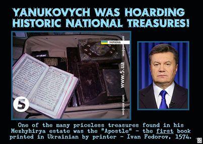 W rezydencji Janukowycza znaleziono także nielegalnie posiadane przez niego dzieła sztuki, m.in. pierwszą książkę wydrukowaną w języku ukraińskim - "Apostoła" z XVI w.