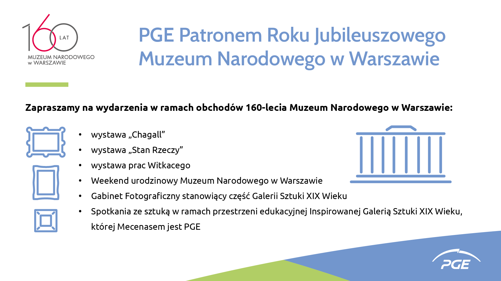W ramach obchodów Roku Jubileuszowego Muzeum Narodowego w Warszawie, PGE będzie patronować wszystkim wydarzeniom i wystawom, które odbędą się w ramach jubileuszu w 2022 roku. Rozpoczną się one wystawą prac wybitnego artysty Marca Chagalla oraz wystawą „Stan rzeczy". Latem natomiast Muzeum zaprezentuje prace Stanisława Ignacego Witkiewicza. Zwiedzający będą mieli też okazję do zapoznania się z rzadko pokazywanymi numizmatami Gabinetu Monet i Medali MNW. Odbędzie się również wystawa „Przesilenie. Malarstwo Północy 1880-1910", która będzie nawiązywać do wieloletnich międzynarodowych współprac Muzeum.