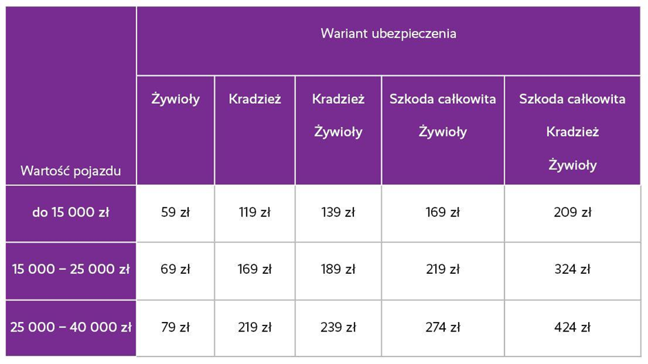 Pan Andrzej wybrał wariant chroniący przed ponoszeniem kosztów wynikających z niszczycielskiej siły żywiołów lub powstałych w razie zdarzenia skutkującego szkodą całkowitą. Oto jak wyglądają wszystkie dostępne opcje: