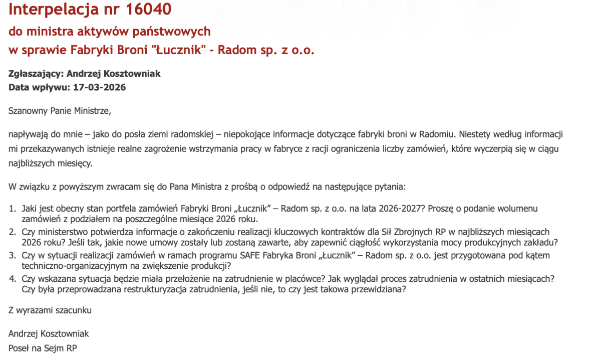Uprzejmie informuję, że z informacji przekazanych przez Zarząd Fabryki Broni „Łucznik” – Radom Sp. o.o. (dalej: FB Łucznik, Spółka) wynika, iż obecny poziom zakontraktowanych zamówień nie zapewnia pełnego wykorzystania dostępnych mocy produkcyjnych w perspektywie najbliższych czterech lat. Aktualny wolumen zamówień pozostaje istotnie niższy od zdolności produkcyjnych osiągniętych w wyniku zrealizowanego programu inwestycyjnego, którego celem było długoterminowe zwiększenie potencjału produkcyjnego Spółki zgodnie z kierunkowymi potrzebami zgłaszanymi przez resort obrony narodowej. Polska Grupa Zbrojeniowa S.A. (dalej: PGZ S.A.). jako większościowy udziałowiec FBŁucznik, wspiera działania Zarządu Spółki w obszarze aktywnego pozyskiwania generujących przychody kontraktów. Jednocześnie pozostaje w bieżącym kontakcie z Agencją Uzbrojenia oraz wyraża gotowość do udzielania Spółce dalszego wsparcia w działaniach ukierunkowanych na zdobywanie kolejnych zamówień. Ponadto, zgodnie z posiadanymi informacjami, w przyszłości możliwe jest nawiązanie współpracy FB Łucznik również ze służbami podległymi Ministerstwu Spraw Wewnętrznych i Administracji.