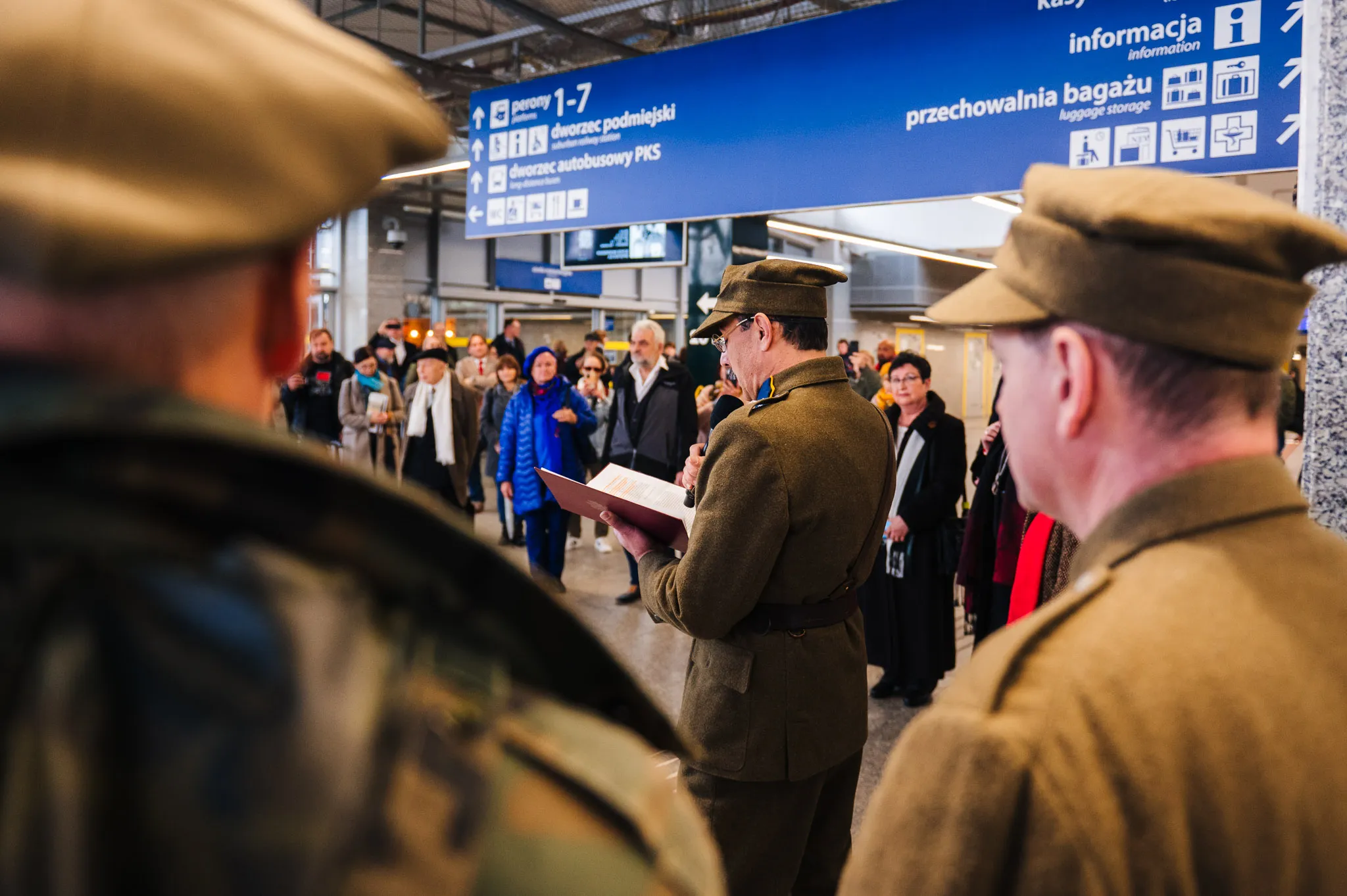 Podobny flashmob odbył się na dworcu Kraków Główny. Tam z kolei podróżni, oprócz wysłuchania utworów patriotycznych, mogli zobaczyć przechadzającego się po dworcu aktora przebranego za Józefa Piłsudskiego. To właśnie imię Józefa Piłsudskiego nosi krakowski dworzec.