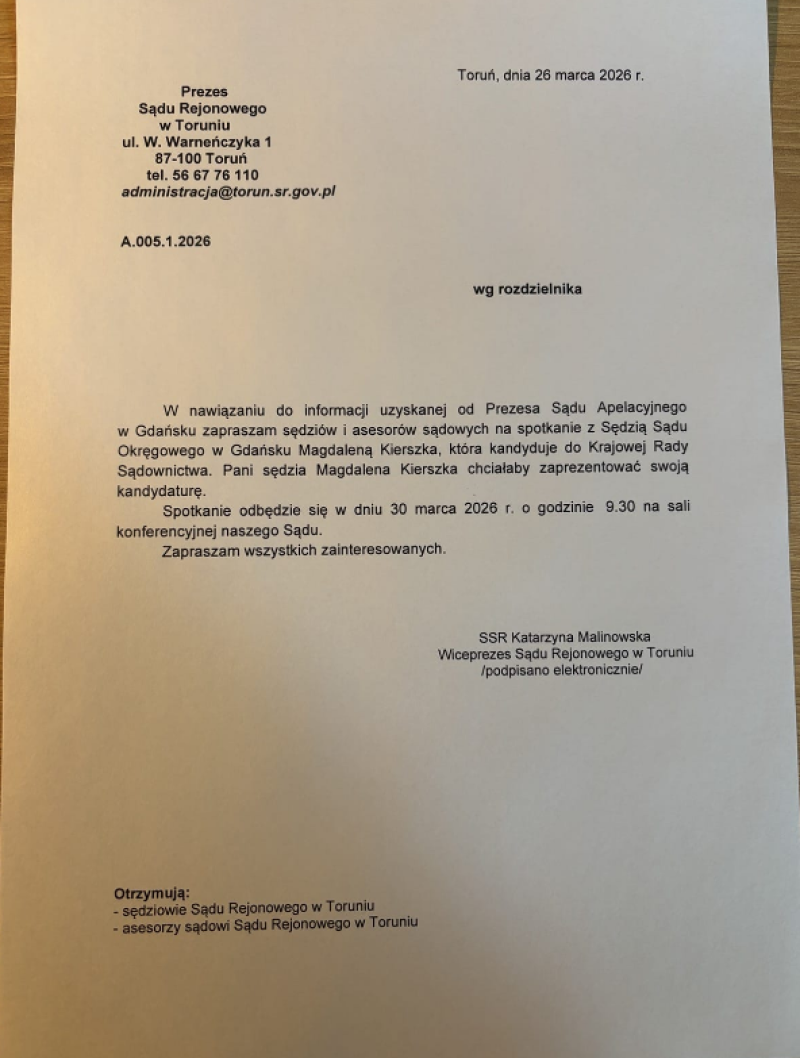 Tego samego dnia o godzinie 9:30 w sali konferencyjnej Sądu Rejonowego w Toruniu odbędzie się z kolei spotkanie z sędzią Sądu Okręgowego w Gdańsku, Magdaleną Kierszką. Dotarliśmy do treści zaproszenia skierowanego przez wiceprezes Sądu Rejonowego w Toruniu sędzię Katarzynę Malinowską.
