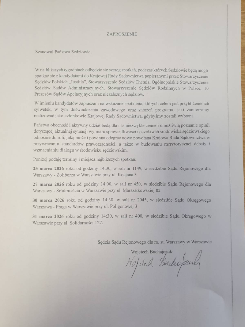 Portal Niezależna.pl dotarł do pisma wystosowanego przez sędziego Wojciecha Buchajczuka z Sądu Rejonowego w Warszawie skierowanego do stołecznych sędziów. W korespondencji zaprosił do udziału w spotkaniach organizowanych z kandydatami do KRS popieranymi przez Stowarzyszenie Sędziów Polskich ,,Iustitia", Stowarzyszenie Sędziów Themis, Ogólnopolskie Stowarzyszenie Sędziów Sądów Administracyjnych, Stowarzyszenie Sędziów Rodzinnych w Polsce a także przez 10 Prezesów Sądów Apelacyjnych (!).