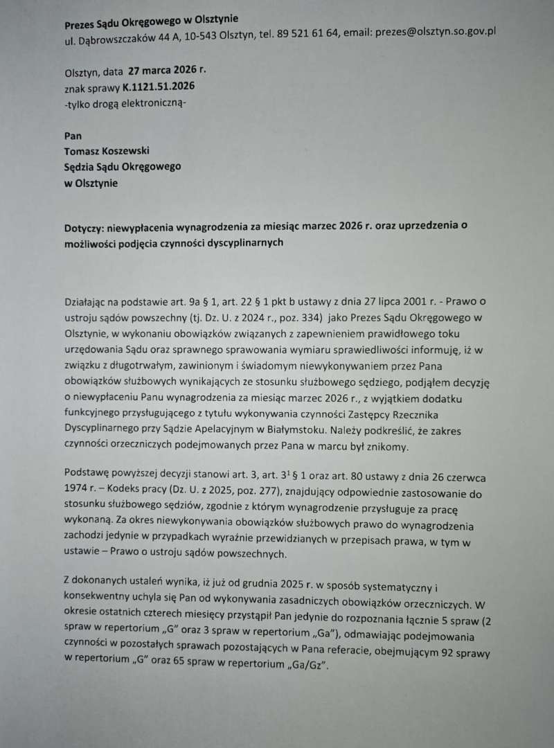 W miniony piątek, 27 marca br., prezes SO w Olsztynie przesłał sędziemu Koszewskiemu pismo, w którym poinformował o niewypłaceniu wynagrodzenia za marzec 2026 “w związku z długotrwałym, zawinionym i świadomym niewykonywaniem obowiązków służbowych”. Jednocześnie uprzedził go o możliwości podjęcia czynności dyscyplinarnych.