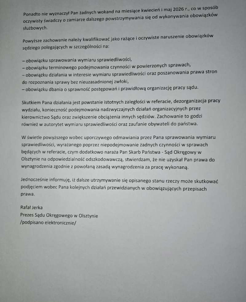 Prezes powołał się na Prawo o ustroju sądów powszechnych, Kodeks pracy, a także na obowiązek zapewnienia “prawidłowego toku urzędowania sądu” i “sprawne sprawowanie wymiaru sprawiedliwości”. Podkreślił, że “wynagrodzenie przysługuje za pracę wykonaną” i zarzucił sędziemu Koszewskiemu, że od grudnia ub.r. “w sposób systematyczny i konsekwentny” uchyla się od obowiązków orzeczniczych oraz że nie wyznaczył żadnych wokand na miesiące kwiecień i maj 2026 r.