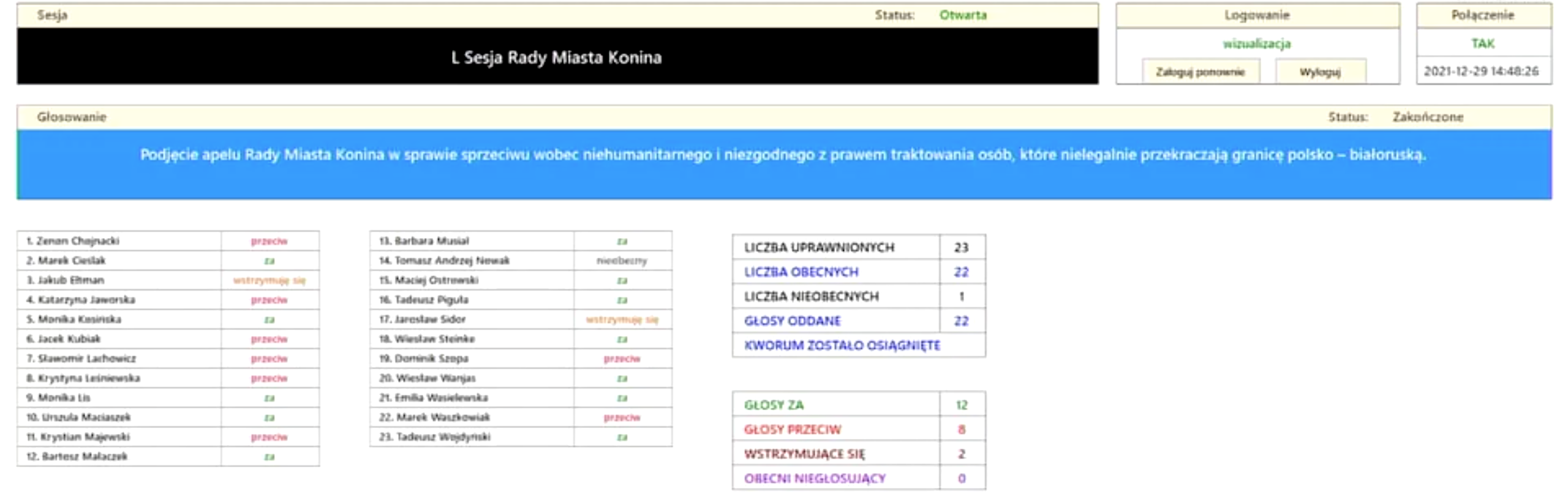 „Podjęcie apelu Rady Miasta Konina w sprawie sprzeciwu wobec niehumanitarnego i niezgodnego z prawem traktowania osób, które nielegalnie przekraczają granicę polsko-białoruską” - brzmiał ostatni punkt porządku obrad środowej, 50. Sesji Rady Miasta Konina.