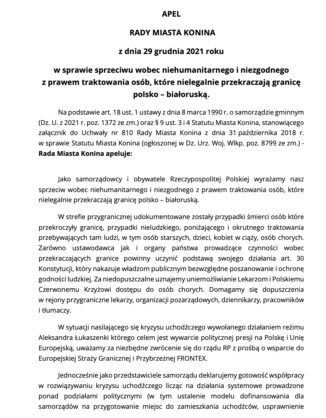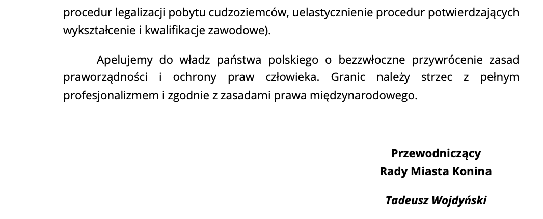 „to wpisanie się w polityczną narrację, krytykowanie rządu za działania, które podejmuje na granicy, obarczanie odpowiedzialnością za kryzys humanitarny. Jeśli jednak widzimy, że autorami są członkowie konińskiego Komitetu Obrony Demokracji, stawiam pytanie: co tym ludziom może przyświecać? Wszystkie ich działania są krytyką polskiego rządu. Apel nie ma na celu realnej pomocy ludziom na granicy. Próbuje się pokazać rozdźwięk między rządem a samorządem. Samorządem, który chce pomagać, działać humanitarnie, a rządem, który jest bezduszny”.