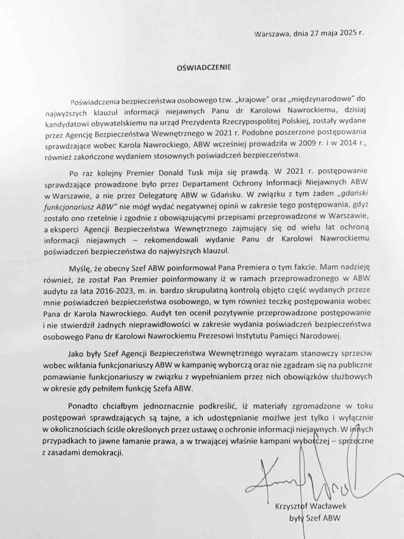 "Po raz kolejny Premier Donald Tusk mija się prawdą. W 2021 r. postępowanie sprawdzające prowadzone było przez Departament Ochrony Informacji Niejawnych ABW w Warszawie, a nie przez Delegaturę ABW w Gdańsku. W związku z tym żaden „gdański funkcjonariusz ABW” nie mógł wydać negatywnej opinii w zakresie tego postępowania, gdyż zostało ono rzetelnie i zgodnie z obowiązującymi przepisami przeprowadzone w Warszawie, a eksperci Agencji Bezpieczeństwa Wewnętrznego zajmujący się od wielu lat ochroną informacji niejawnych – rekomendowali wydanie Panu dr Karolowi Nawrockiemu poświadczeń bezpieczeństwa do najwyższych klauzul" - napisał w oświadczeniu Krzysztof Wacławek, były szef ABW. To odpowiedź na manipulacyjny i kłamliwy wpis Donalda Tuska.