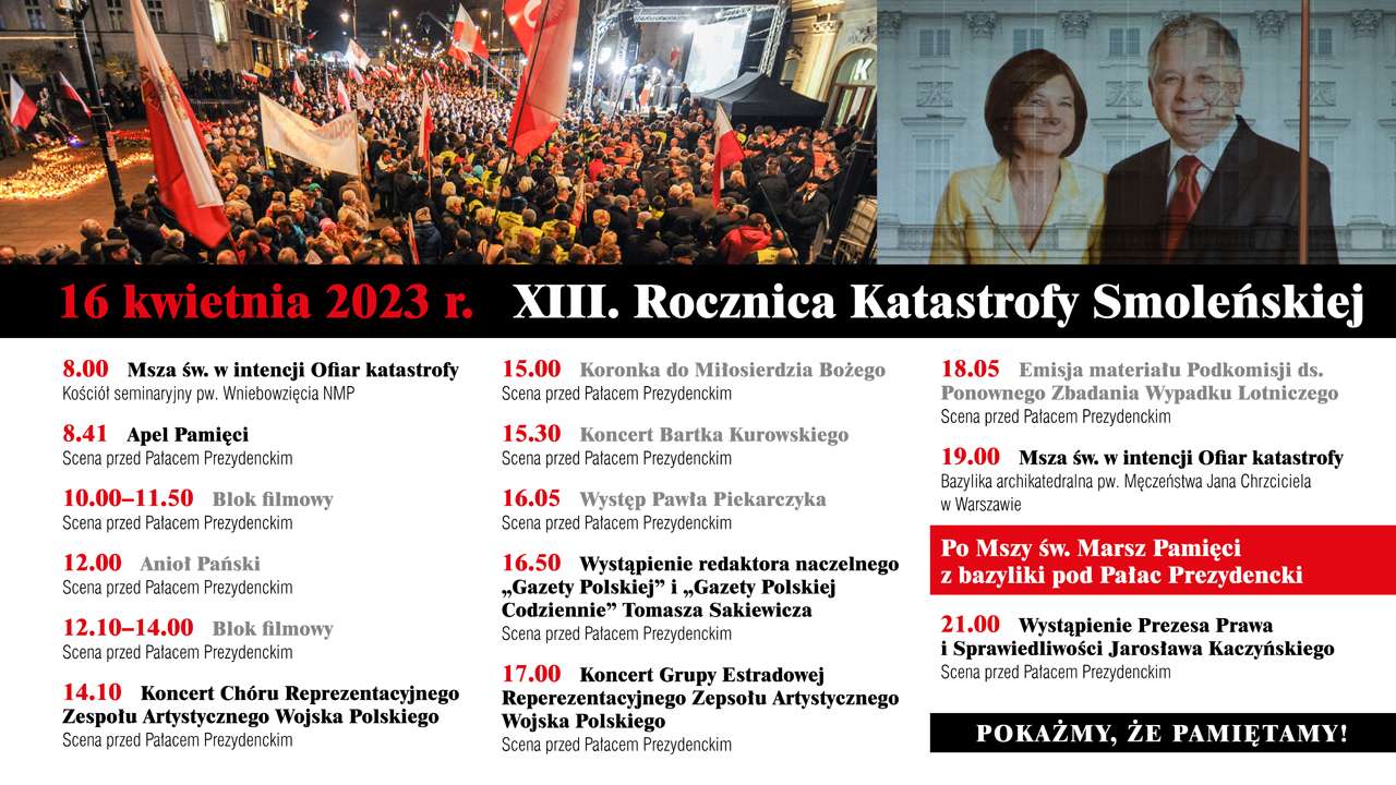 Oficjalne, centralne obchody 13. rocznicy katastrofy smoleńskiej przesunięto na 16 kwietnia z uwagi na to, że 10 kwietnia przypadał w Poniedziałek Wielkanocny. Większość wydarzeń odbędzie się na specjalnie przygotowanej scenie przed Pałacem Prezydenckim na Krakowskim Przedmieściu w Warszawie.