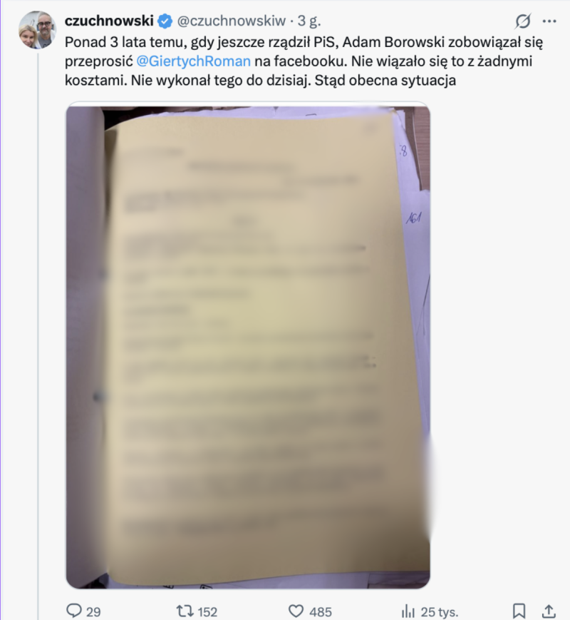 „Ponad 3 lata temu, gdy jeszcze rządził PiS, Adam Borowski zobowiązał się przeprosić Romana Giertycha na facebooku. Nie wiązało się to z żadnymi kosztami. Nie wykonał tego do dzisiaj. Stąd obecna sytuacja” – odniósł się do rozstrzygnięcia.