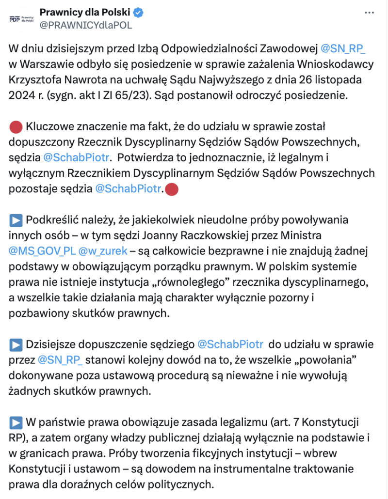 „Dzisiejsze dopuszczenie sędziego Piotra Schaba do udziału w sprawie przez Sąd Najwyższy stanowi kolejny dowód na to, że wszelkie „powołania” dokonywane poza ustawową procedurą są nieważne i nie wywołują żadnych skutków prawnych”