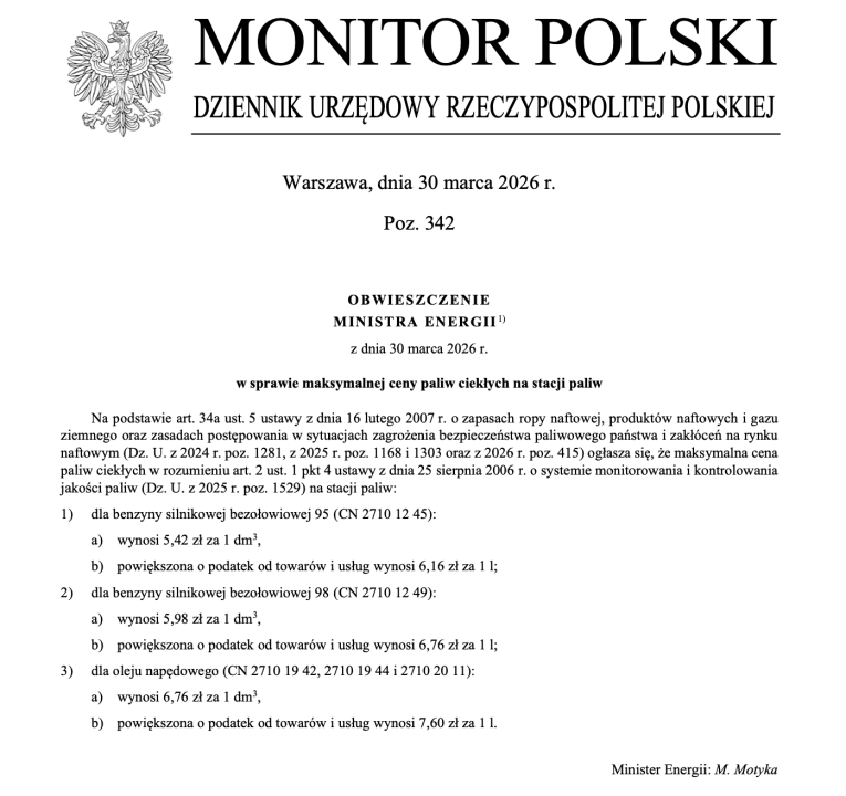 W Monitorze Polskim pojawiło się dziś obwieszczenie ministra energii, Miłosza Motyki. Zawarto w nim maksymalne stawki za paliwo na czas obowiązywania obniżek podatku VAT oraz akcyzy.