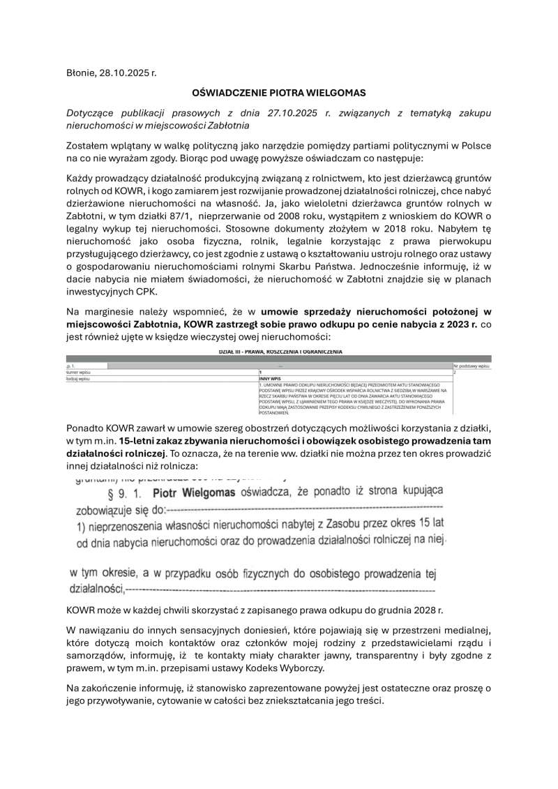 W przesłanym dziś mediom oświadczeniu, Piotr Wielgomas podkreśla, że nie złamał prawa kupując działkę, planował używać jej zgodnie z przeznaczeniem, jako rolniczą, oraz że sama umowa sprzedaży obwarowana była licznymi zastrzeżeniami. Najważniejszym jest prawo odkupu działki przez KOWR po cenie sprzedaży z 2023 roku do końca roku 2028.