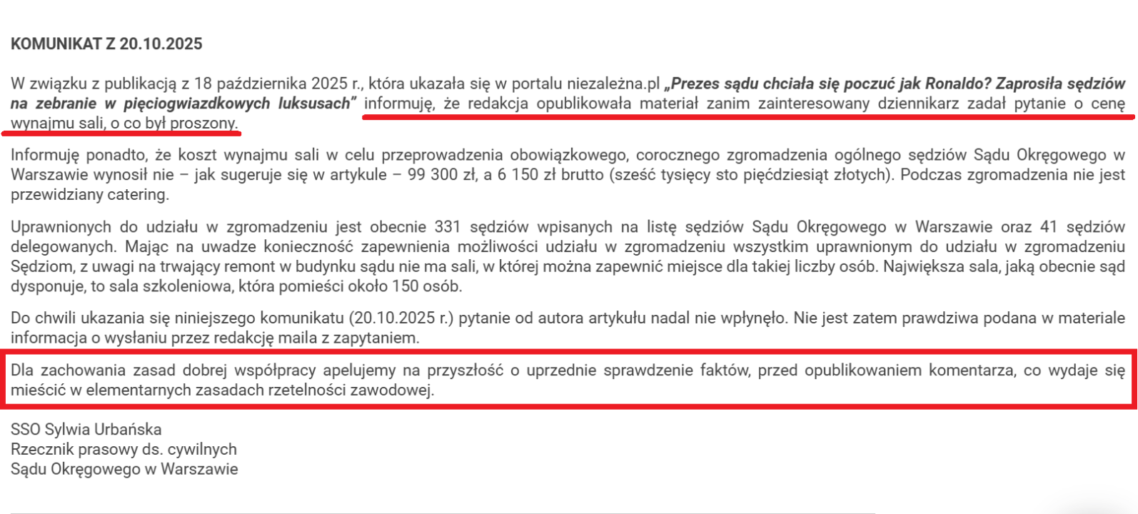 Na koniec wysłaliśmy wiadomość sms-wą do sędzi Urbańskiej. Podaliśmy fakty oraz zapytaliśmy, czy komunikat zostanie sprostowany.