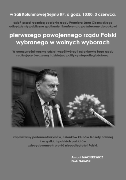 Antoni Macierewicz i Piotr Naimski, ministrowie w rządzie Jana Olszewskiego, zapraszają 3 czerwca o godzinie 10.00 do Sali Kolumnowej Sejmu RP na publiczne spotkanie i konferencję poświęconą dorobkowi "pierwszego powojennego rządu Polski wybranego w wolnych wyborach".