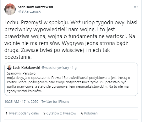 To jednak nie jedyna wpadka, bowiem odpowiedź Karczewskiego przedstawiła na swojej antenie stacja TVN24. Prowadząca z pełną powagą mówiła o słowach kierowanych przez Karczewskiego "do Kołakowskiego".