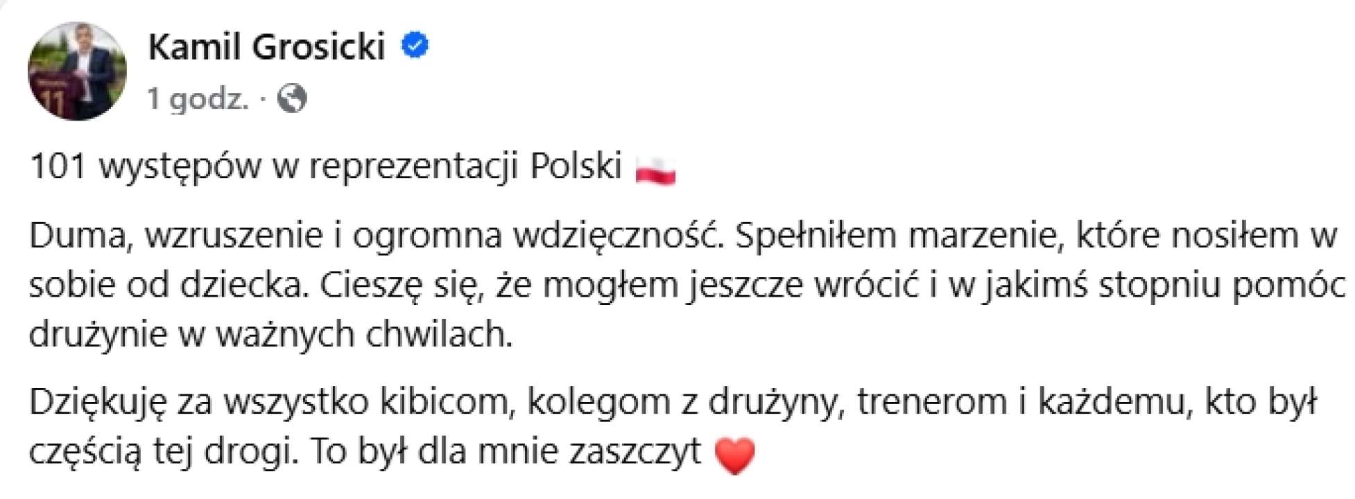 101 występów w reprezentacji Polski. Duma, wzruszenie i ogromna wdzięczność. Spełniłem marzenie, które nosiłem w sobie od dziecka. Cieszę się, że mogłem jeszcze wrócić i w jakimś stopniu pomóc drużynie w ważnych chwilach. Dziękuję za wszystko kibicom, kolegom z drużyny, trenerom i każdemu, kto był częścią tej drogi. To był dla mnie zaszczyt