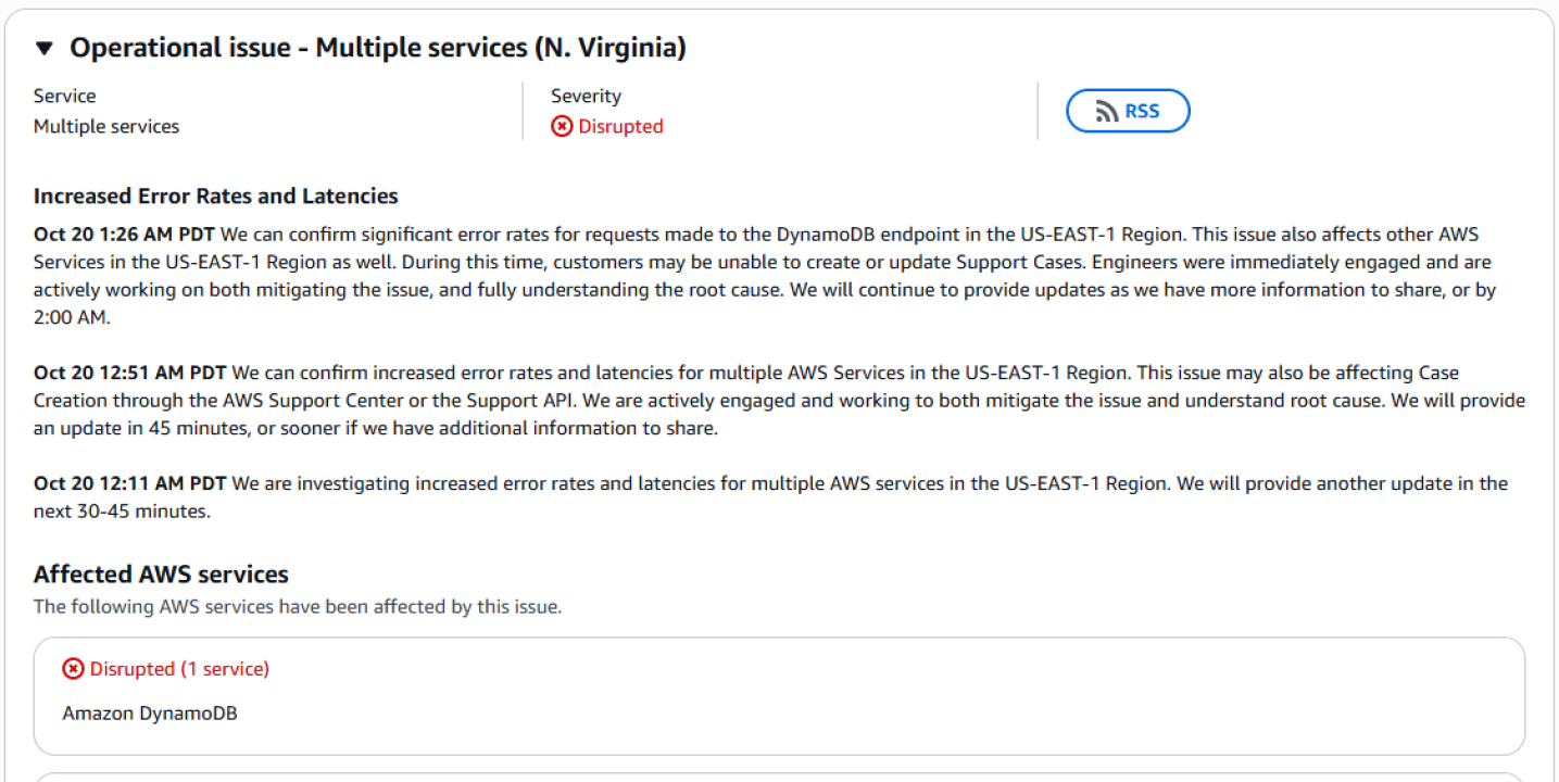 Na stronach AWS pojawiła się informacja o "licznych wskaźnikach błędów" w regionie US-EAST-1. Zapewniono o podjęciu działań zmierzających do zniwelowania skutków awarii.