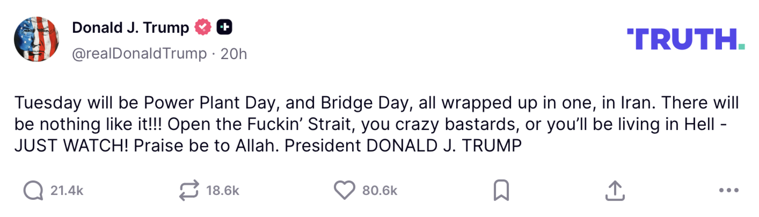 „Wtorek będzie w Iranie Dniem Elektrowni i Dniem Mostu, wszystko w jednym. Nie będzie niczego podobnego!!! Otwórzcie tę cholerną Cieśninę, wy szalone dranie, albo zaznacie piekła”
