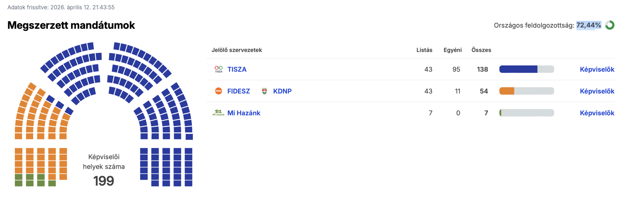 W przeliczeniu na mandaty, Tisza zdobywa na chwilę obecną (ponad 70 proc. oddanych głosów) 138 miejsc w 199-osobowym parlamencie, a Fidesz - 54. Prawicowy Ruch Naszej Ojczyzny może liczyć na 7 mandatów.