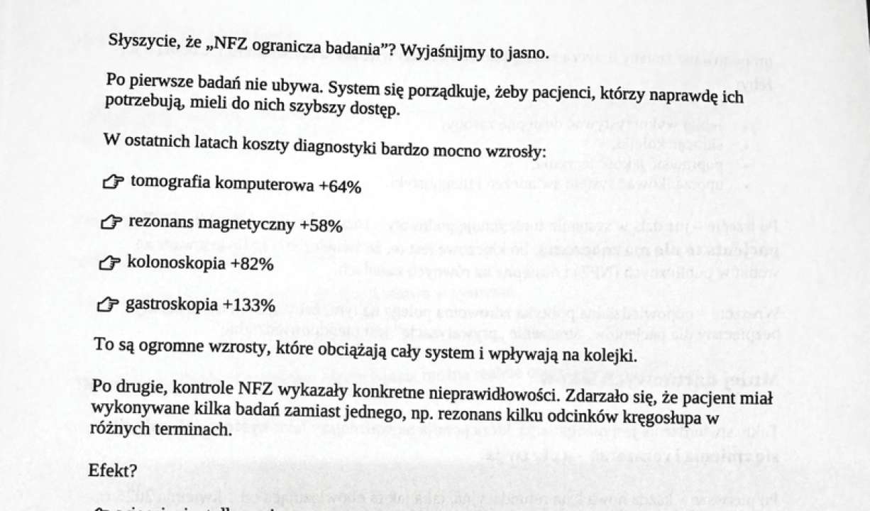 W instrukcji czytamy: „Słyszycie, że NFZ ogranicza badania? Wyjaśnijmy to jasno. Po pierwsze, badań nie ubywa. System się porządkuje, żeby pacjenci, którzy naprawdę ich potrzebują, mieli do nich dostęp”.