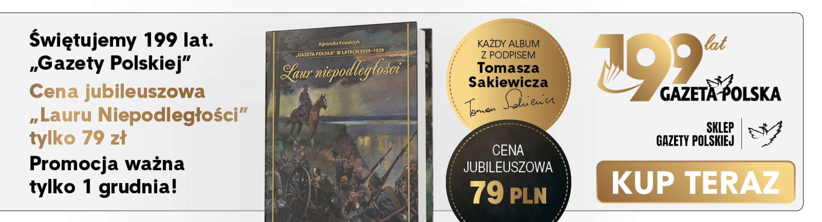 Aby uczcić tę rocznicę, przygotowaliśmy wyjątkową ofertę: album „Laur Niepodległości” z podpisem red. nacz. Tomasza Sakiewicza teraz dostępny w sklepie Gazety Polskiej w cenie 79 zł. To doskonała pamiątka dla każdego, kto ceni historię i chce ją przekazywać kolejnym pokoleniom.