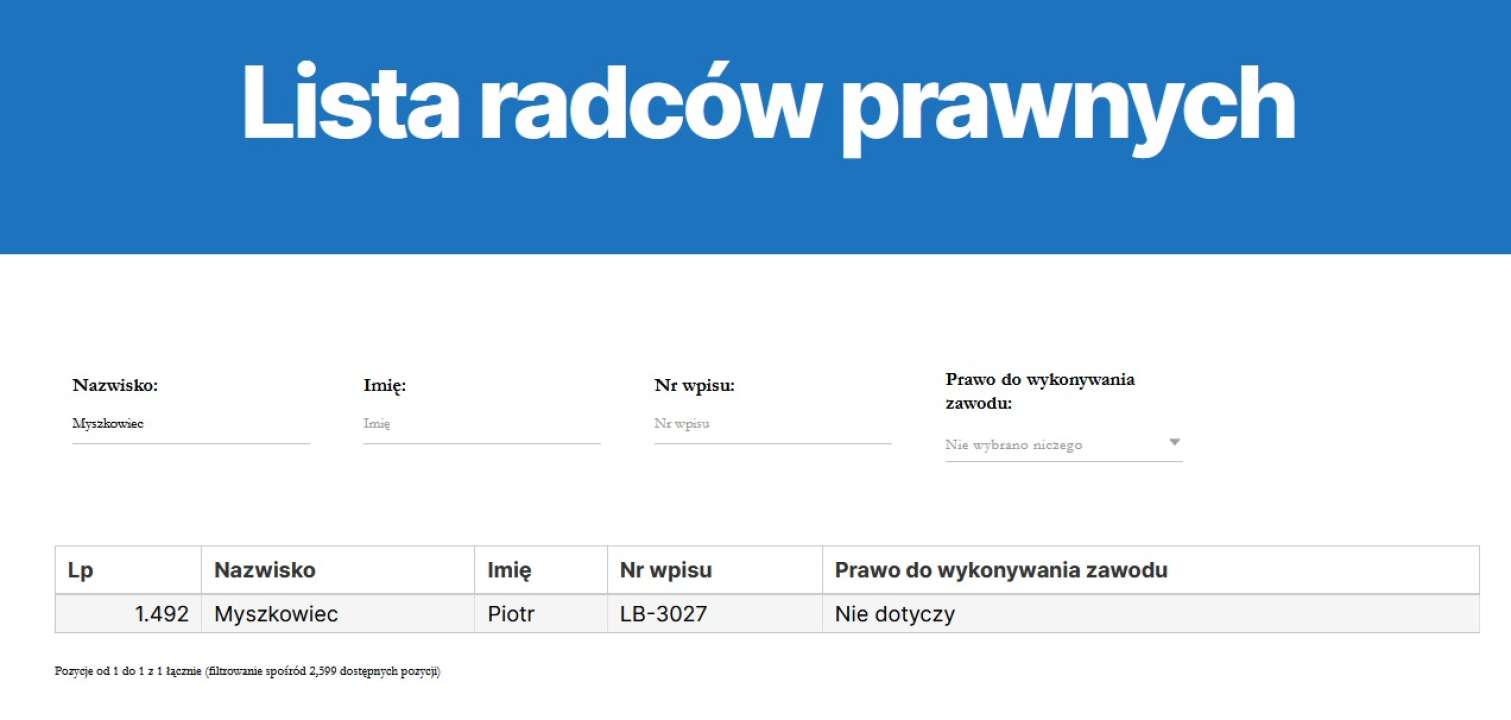 I rzeczywiście, znaleźliśmy Myszkowca na liście radców prawnych w Lublinie.