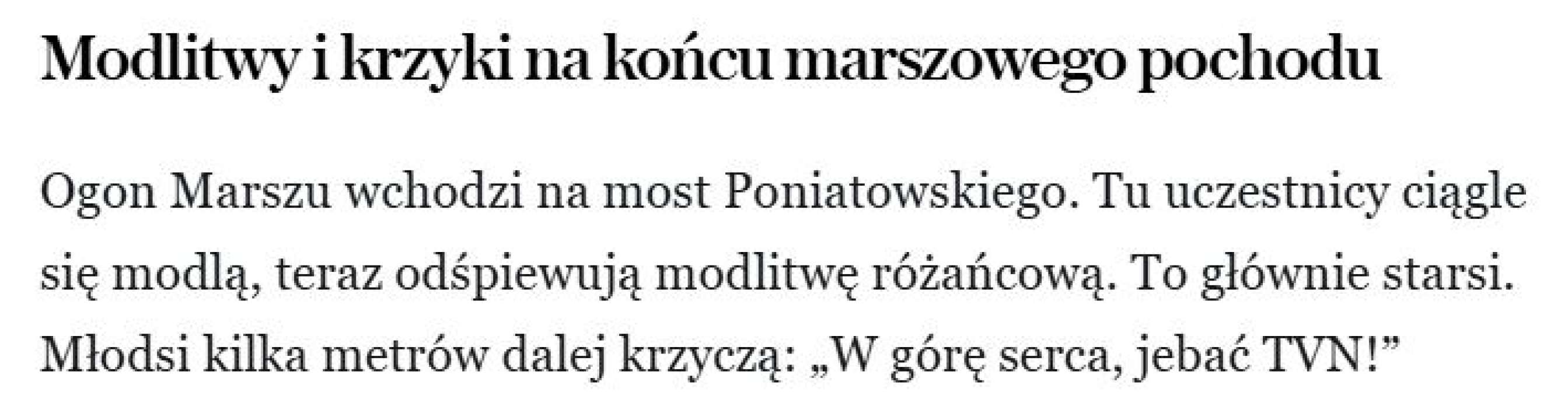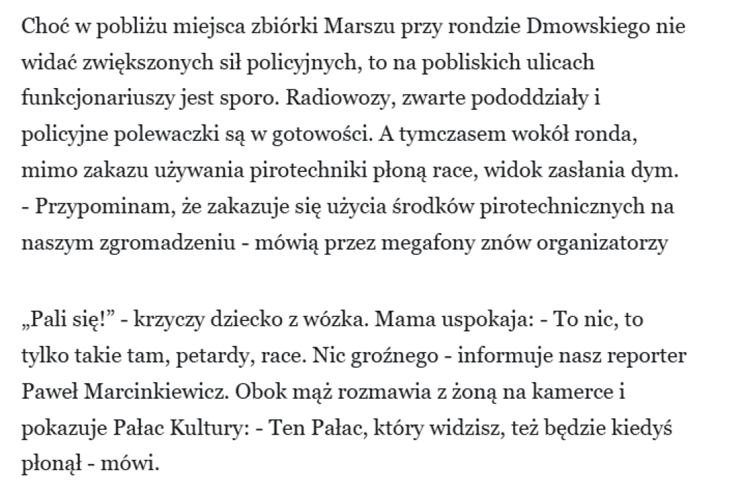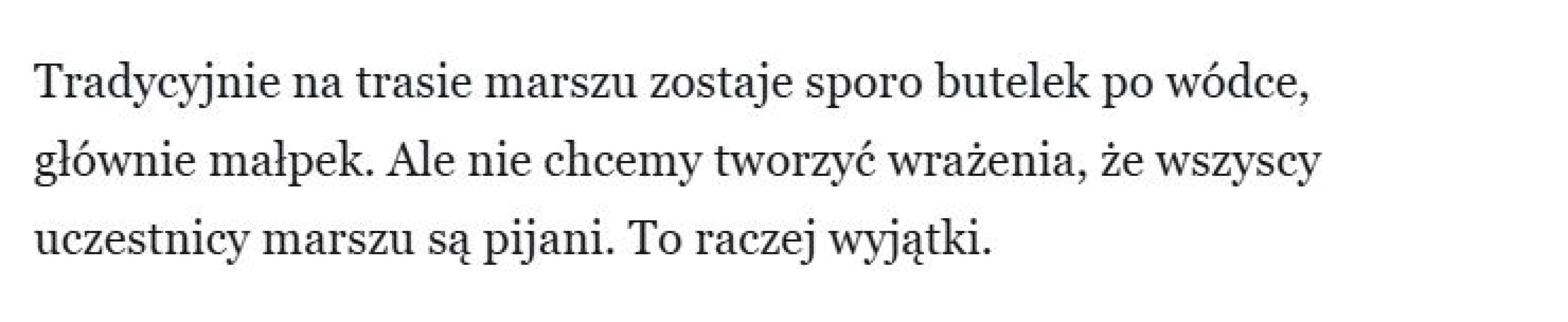 W "Wyborczej" podkreślają także dość często, że na trasie marszu spożywany był alkohol, jednak podkreślają, że nie chcą stworzyć wrażenia, że wszyscy są pijani.