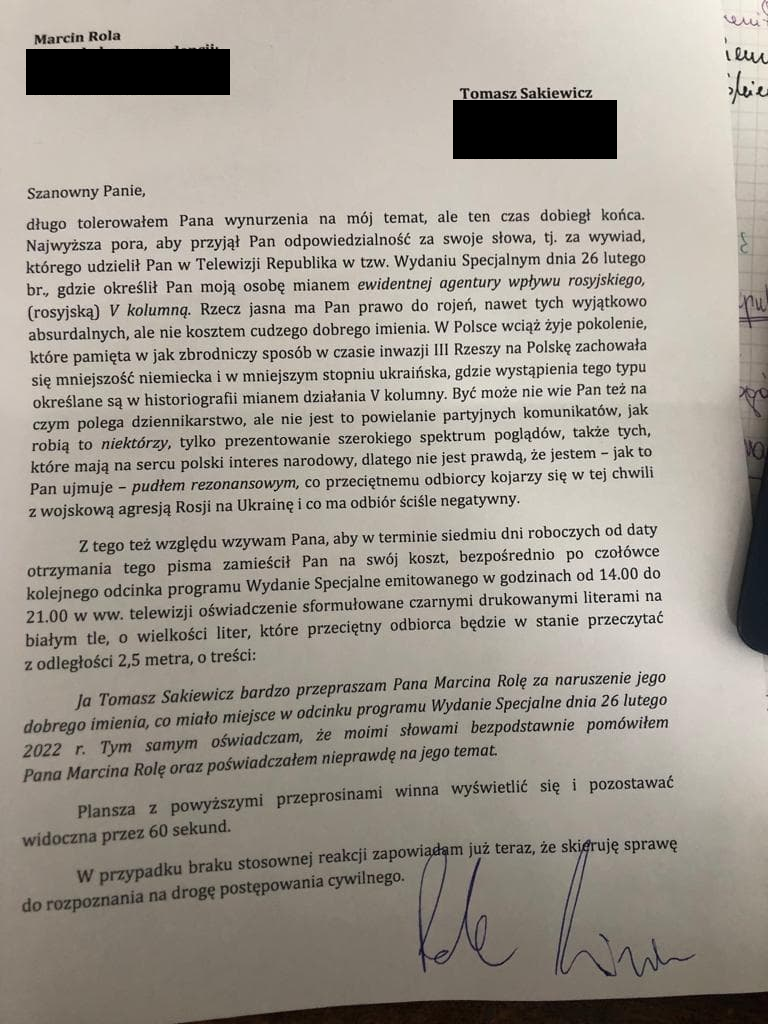 - Szanowny panie, długo tolerowałem Pana wynurzenia na mój temat, ale ten czas dobiegł końca. Najwyższa pora, aby przyjął Pan odpowiedzialność za swoje słowa, tj. za wywiad, którego udzielił Pan w Telewizji Republika w tzw. Wydaniu Specjalnym dnia 26 lutego br., gdzie określił Pan moją osobę mianem "ewidentnej agentury wpływu rosyjskiego, (rosyjską) V kolumną"