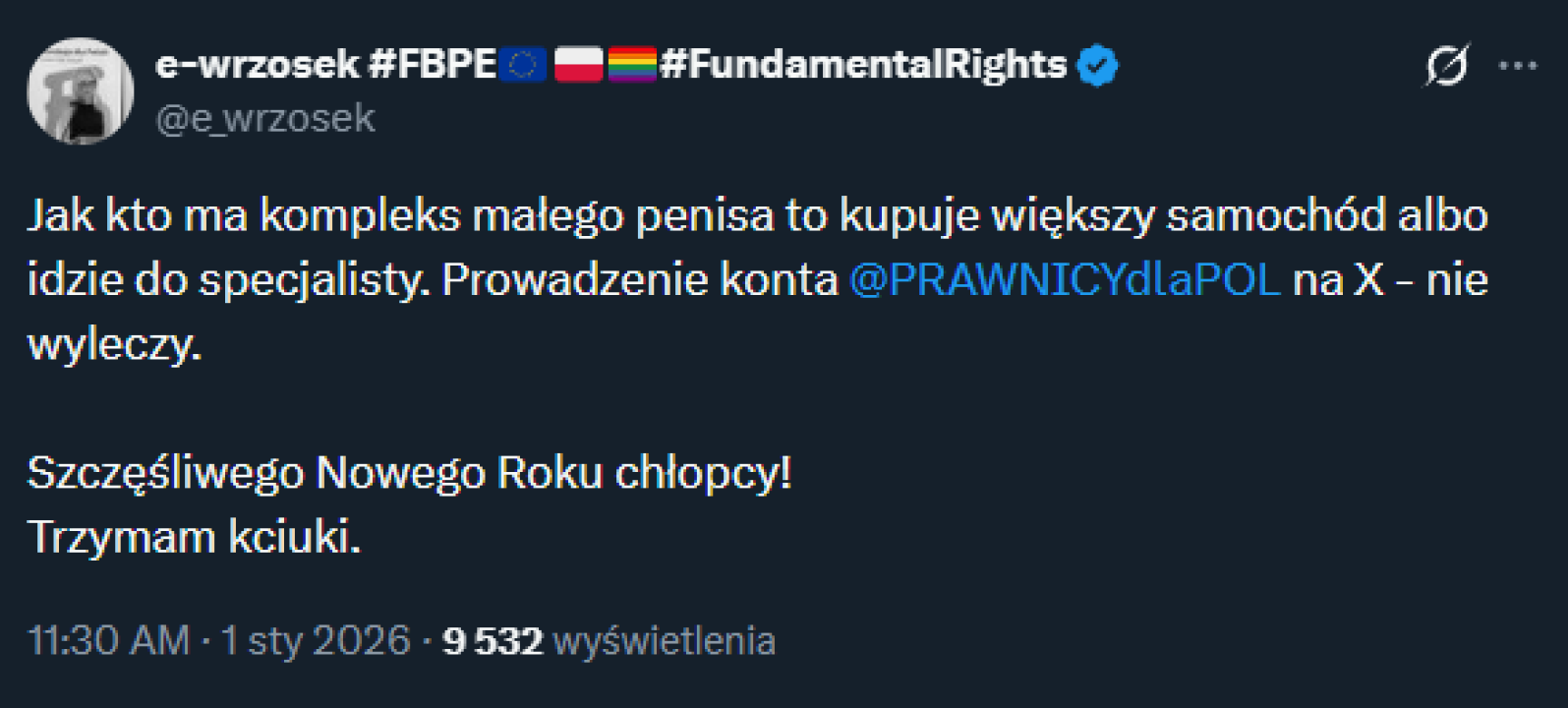 "Jak kto ma kompleks małego penisa to kupuje większy samochód albo idzie do specjalisty. Prowadzenie konta @PRAWNICYdlaPOL na X - nie wyleczy. Szczęśliwego Nowego Roku chłopcy! Trzymam kciuki" - napisała Wrzosek.