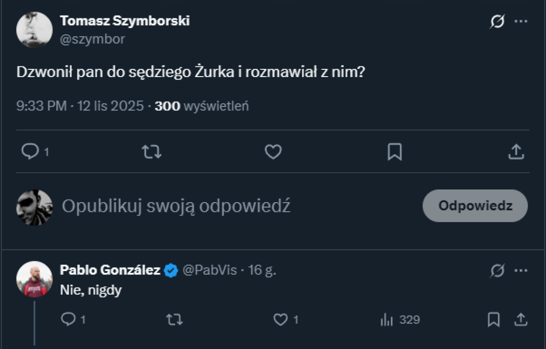 Dziennikarz Tomasz Szymborski zapytał wprost, czy "dzwonił pan do sędziego Żurka i rozmawiał z nim". Odpowiedź z profilu Pablo Gonzalez brzmiała "nie, nigdy".