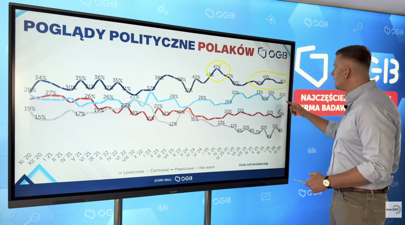 Z najnowszego pomiaru wynika, że prawica pozostaje dominującym nurtem wśród Polaków. Około 41 proc. respondentów określa swoje poglądy jako prawicowe. To wyraźna przewaga nad centrum, które wskazuje 32 proc. badanych.