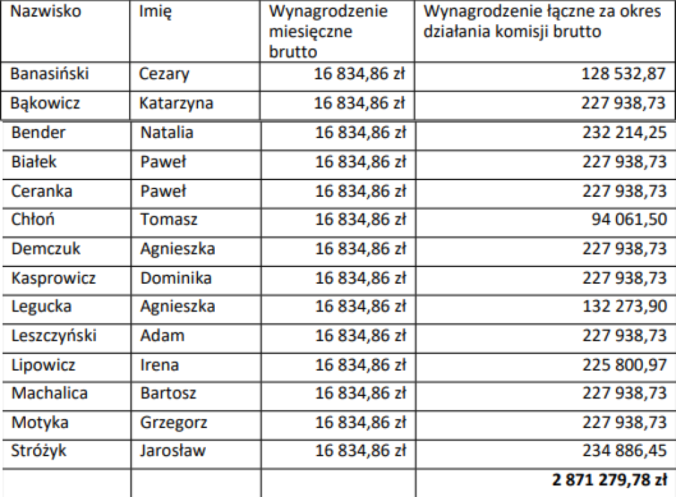 W dokumencie znalazła się również tabela przedstawiająca wynagrodzenia osób wchodzących w skład Komisji. Dowiadujemy się z niej, że gen. Jarosław Stróżyk, jej przewodniczący, zarobił 234 886,45 zł. Łączna suma wynagrodzeń dla 14 członków Komisji wyniosła za to 2 871 279,78 zł. Miesięczne wynagrodzenie brutto wszystkich jej członków to 16 834,86 zł.