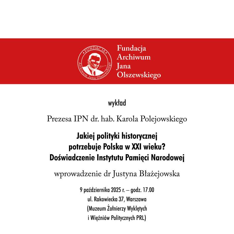 Fundacja Archiwum Jana Olszewskiego zaprasza na spotkanie z Prezesem IPN dr. hab. Karolem Polejowskim poświęcone polityce historycznej. Szczegóły poniżej.