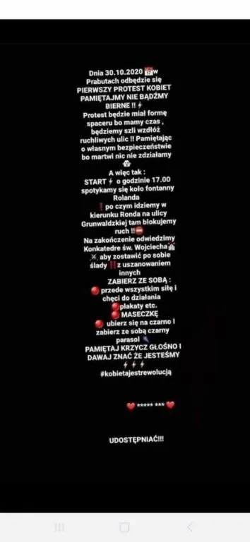 Od czwartku w ubiegłym tygodniu w wielu miastach Polski trwają protesty przeciwko zaostrzeniu prawa aborcyjnego, na skutek orzeczenia Trybunału Konstytucyjnego, który stwierdził, że przepis zezwalający na mocy ustawy z 1993 r. na dopuszczalność aborcji w przypadku dużego prawdopodobieństwa ciężkiego i nieodwracalnego upośledzenia płodu albo nieuleczalnej choroby zagrażającej jego życiu jest niezgodny z konstytucją.