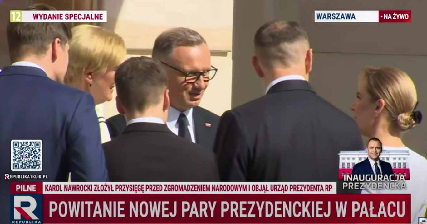 Prezydent RP @NawrockiKn oraz Pierwsza Dama Marta Nawrocka są już w Pałacu Prezydenckim. Parę Prezydencką wita Prezydent @AndrzejDuda z Małżonką. pic.twitter.com/q3J8d7f1ly